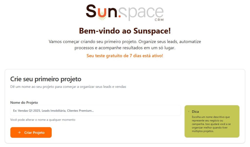 Ao fazer login pela primeira vez (sem projetos criados), você será direcionado automaticamente para a tela de criação de projeto.