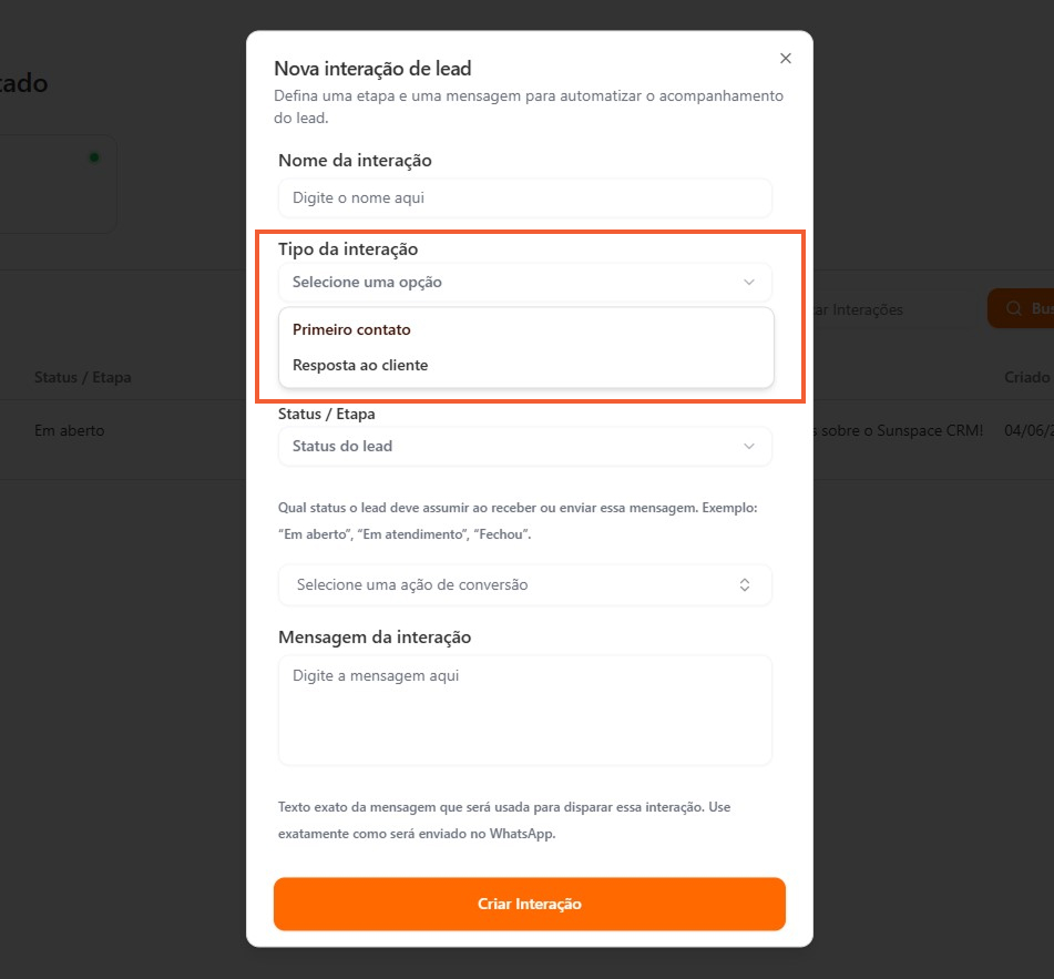 Selecione a etapa do funil para onde o lead será movido após a interação.