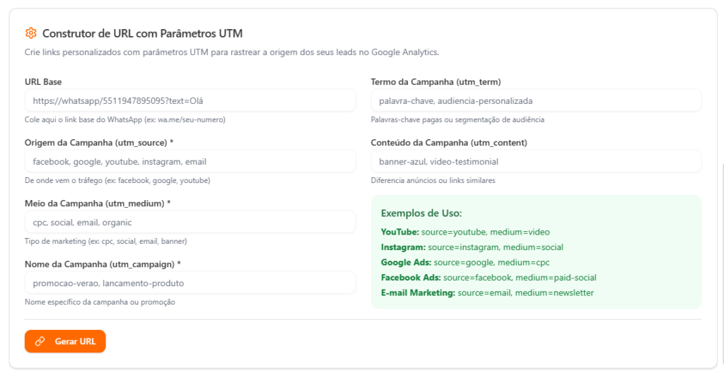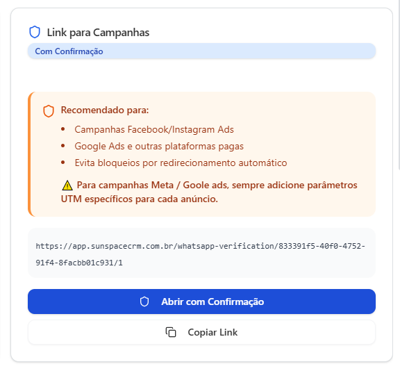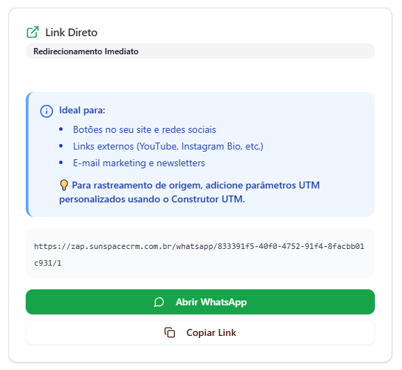 Ideal para campanhas Meta Ads que redirecionam diretamente para o WhatsApp.Use o link gerado como base para rastreio de campanhas.